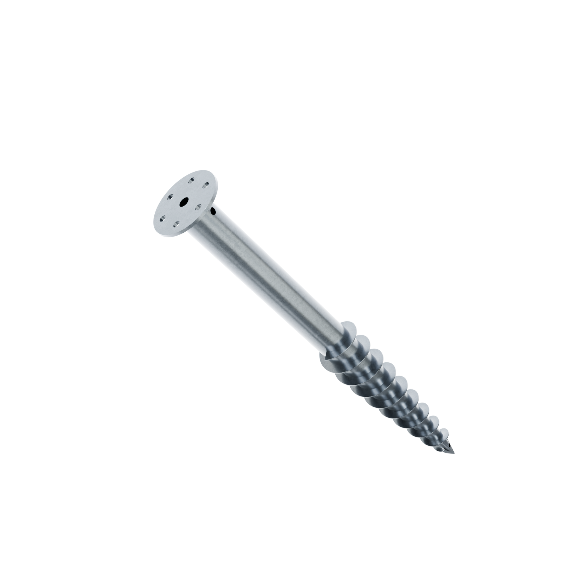 Reinforced galvanized steel foundation screw designed to anchor in the ground a wood or aluminum structure composed of crossed beams and joists. Must be driven into loose soil and backfill to a minimum depth of 75 cm. Effectively and economically replaces concrete. Each screw can support a load of 850 kg in firm ground. Available in lengths of 800mm, 1200mm and 1500mm. Diameter 60mm. Supplied without support fixing head.