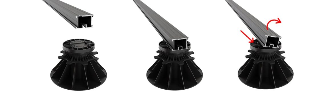 NIVO® paving pedestal can be equipped with a 1 cm thick "Surplot" cap that fit on the pedestal head to clip and unclip easily the 60mm wide aluminum joists of the Structural® framing system.