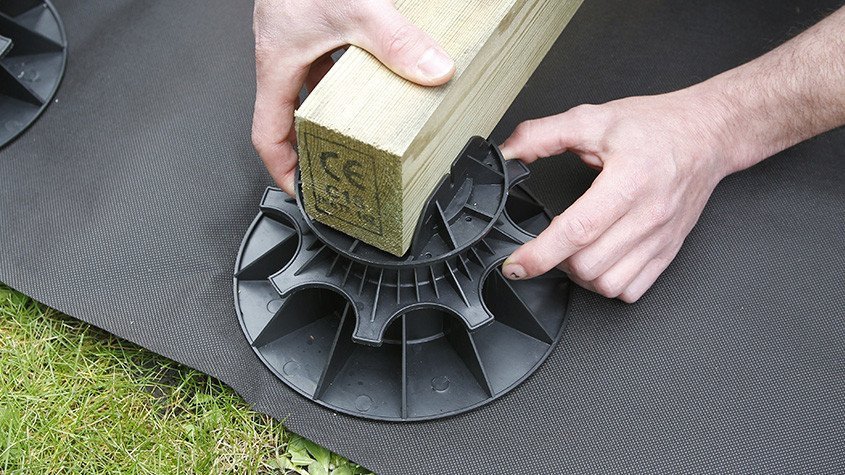 These must be laid on a stabilized ground (waterproofing, concrete, sand, topsoil, etc.). To avoid the weeds growth under the deck it is strongly advised to lay a geotextile felt .