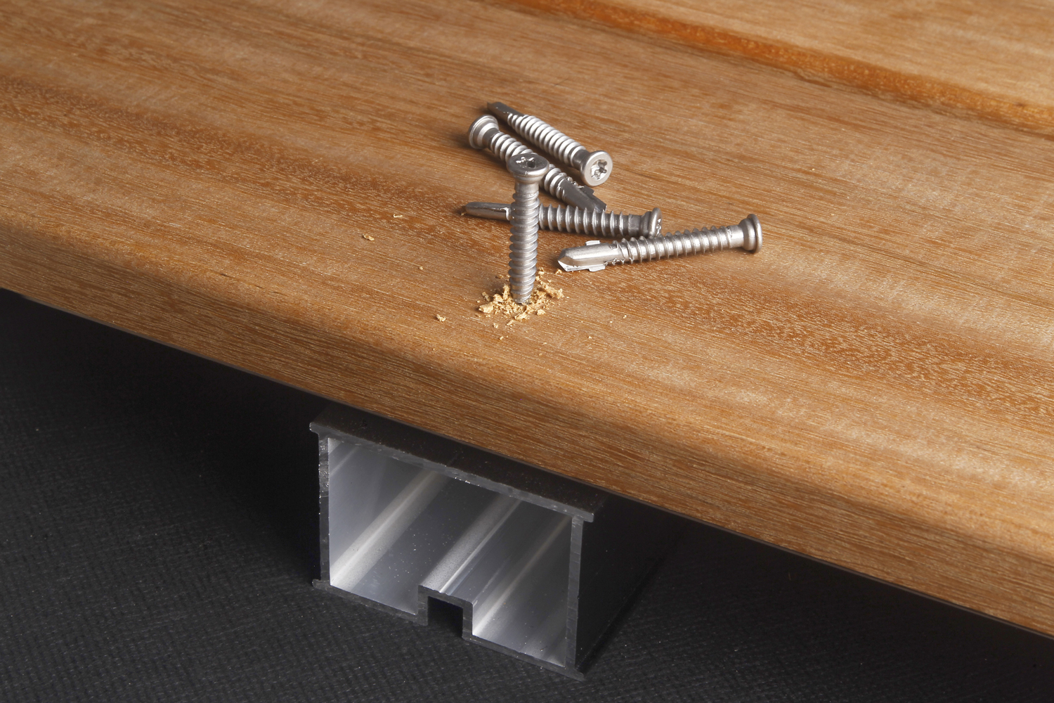 The deck board straightener comes with 2 sizes of stainless steel lugs to fit all joist sections, from 28 to 150 mm high.
