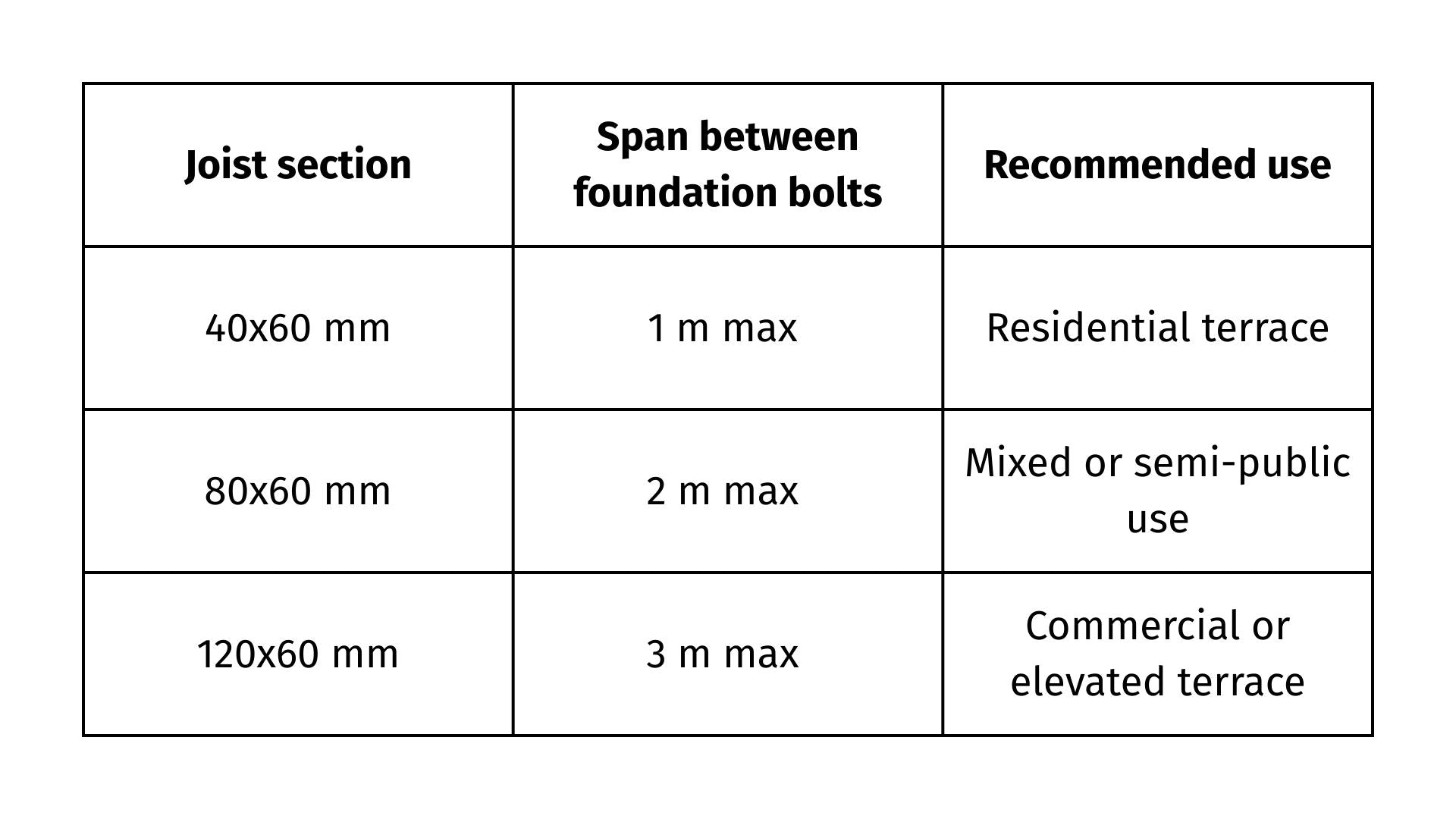 • the maximum centers between screws depending on the joist section (40×60, 80×60, 120×60 mm),