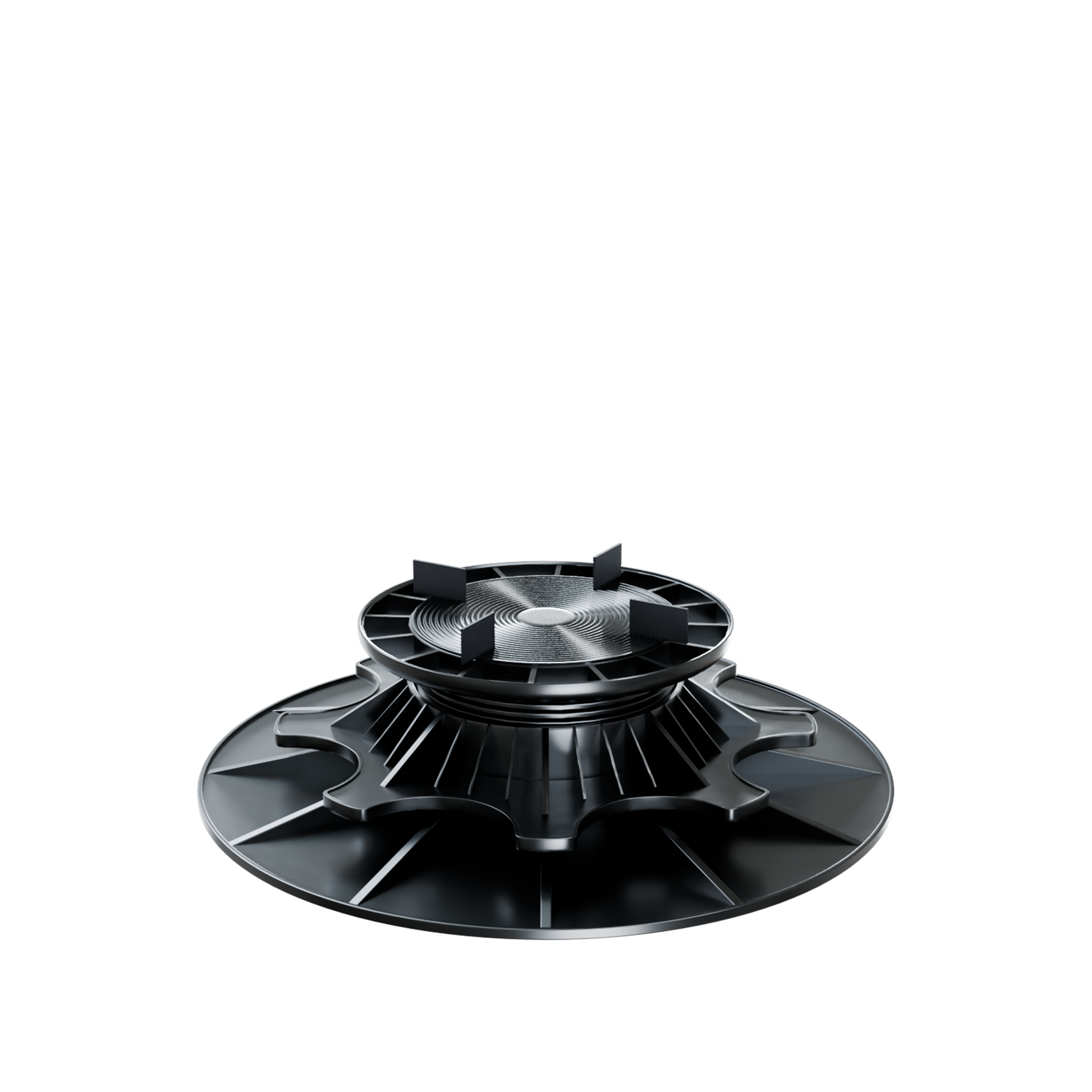 Adjustable pedestals equipped with 4 breakable lugs to support and level 2 cm ceramic or concrete paving. 5 sizes for elevations from 25 mm to 230 mm. Up to 530 mm with stackable 60 mm risers (max 5). Rotary ring for easy and precise adjustment. Each pedestal supports up to 800kg load. Weather and UV resistant. The stable 20cm base prevents sinking into the ground, ideal for use on waterproof flat roofs. Compliant with DTU 43-1 and 51-4.